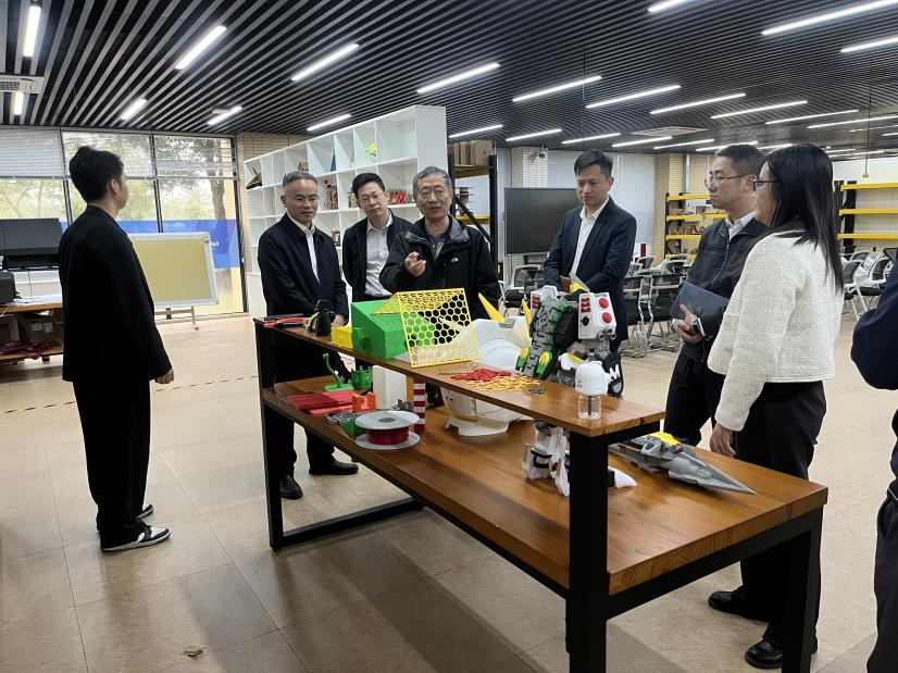 座谈会前,在校方领导的陪同下,与会人员实地参观了学校Fab Lab创新中心。该中心作为校内核心创客实践平台,集数字制造、跨学科创新与产学研转化功能于一体,配备了3D打印、智能控制开发板等先进设备,支持从创意构思到原型制作的全流程实现。现场集中展示了学生研发的人工智能应用原型和智能硬件创新作品等丰硕成果。