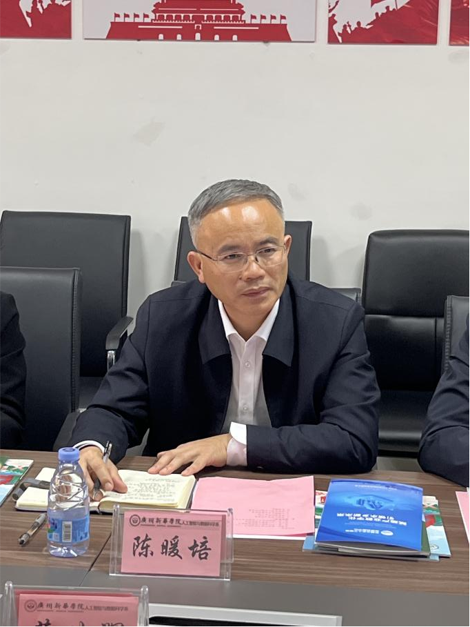 会议伊始,陈暖培委员详细阐述了此次来访的目的与意义。他强调,水乡片区已成功建立"水乡人工智能应用创新中心",而广州新华学院作为该区域内唯一的本科院校,其办学实力得到了广泛认可。此次访问旨在充分发挥政府的桥梁纽带作用,整合三方优势资源,为水乡人工智能产业发展注入新的活力,进而推动区域产业升级转型。随后,与会各方代表分别进行了自我介绍,为后续深化合作奠定了良好基础。