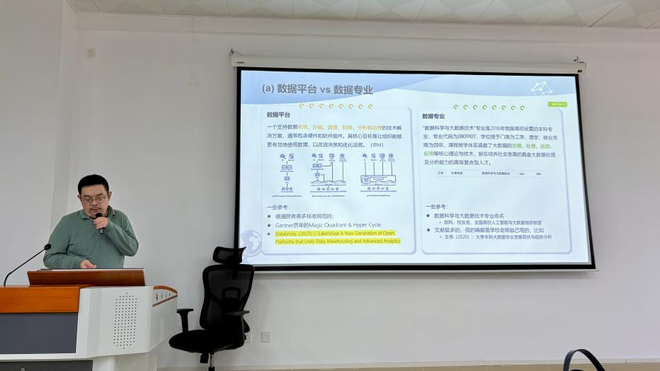 2025年11月12日,人工智能与数据科学系(以下简称“我系”)数据科学与大数据技术教研室以期中检查为契机,组织召开了专业建设专题研讨会。会议请乔梁博士结合行业实践,深入剖析了当前企业大数据平台建设与高校人才培养之间的差异,并为人才培养方案的优化提出了前瞻性建议。