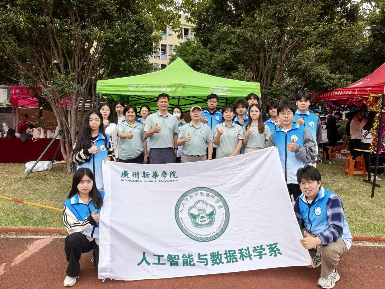 开幕式结束后,我系师生们聚在场地旁合影留念。大家簇拥着印有“广州新华学院 人工智能与数据科学系”的旗帜,笑脸里藏着对赛事的期待,浅绿的队服与身后的运动场相映,定格下团结向上的集体模样。