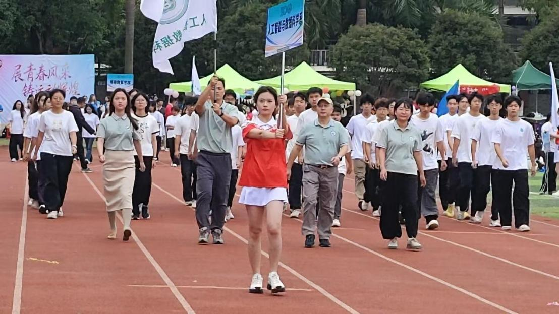 彩旗招展,步履铿锵。11月12日,广州新华学院南田径场的跑道上,各院系方阵开启了运动会的首场“展演”。人工智能与数据科学系(以下简称“我系”)师生们身着统一服装,举着印学系的旗帜与标牌,整齐划一地走过主席台,身后“展青春风采 铸运动辉煌”的横幅,将现场的热烈氛围拉满,每一步都踏响着青春的节拍。