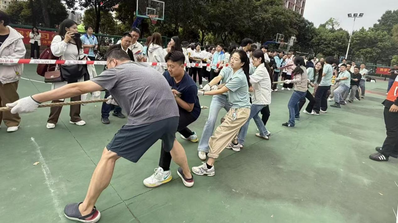 趣味项目区的拔河比赛成了全场焦点。麻绳两端,我系的教师们身体后倾、紧攥绳索。场边观众的加油声此起彼伏,紧绷的绳结、涨红的脸颊,将“团结协作”的底色揉进了这场欢笑与较劲。