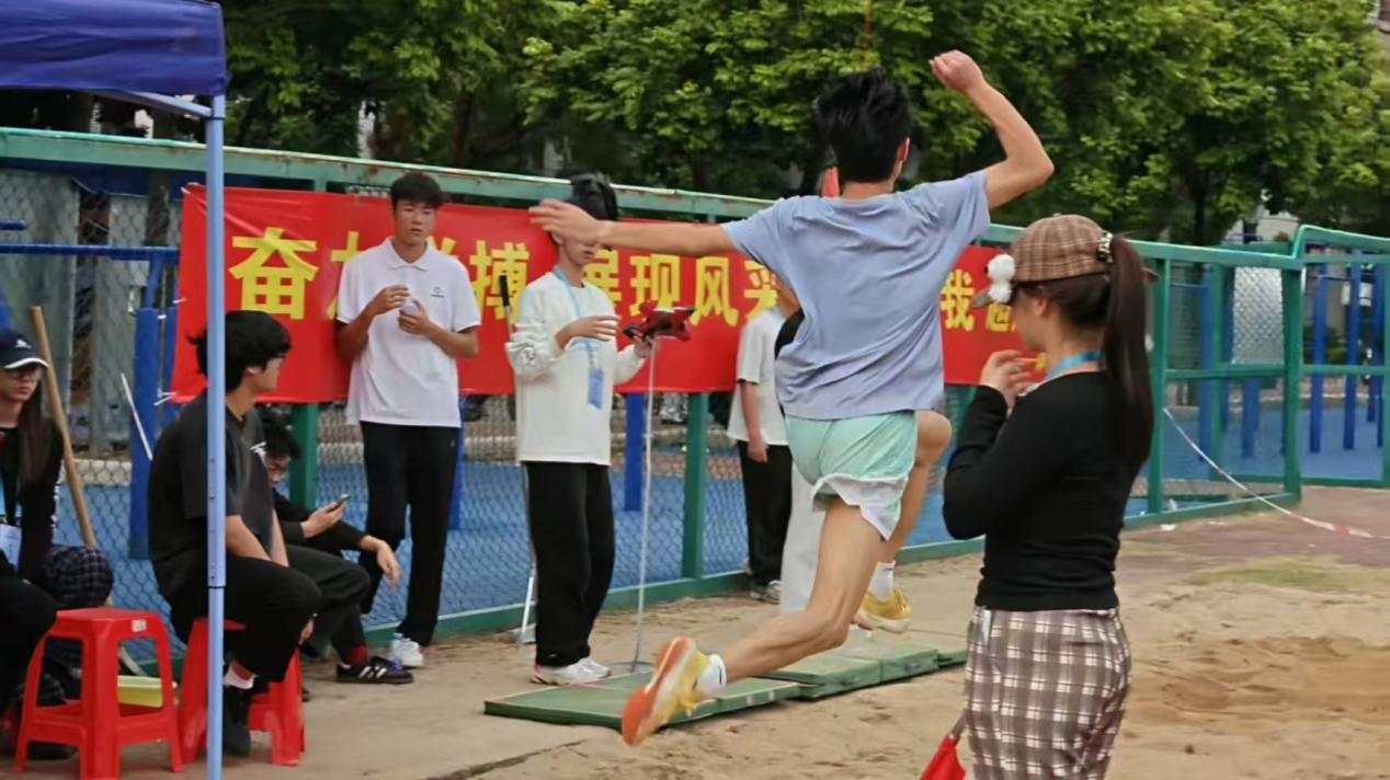 跳远沙坑旁,一道身影腾空跃起。选手舒展身体,在半空中划出轻盈的弧线,身后“奋力拼搏 展现风采”的红色横幅,成了这一时刻最贴切的注脚,沙粒扬起的瞬间,青春的张力在此刻绽放。