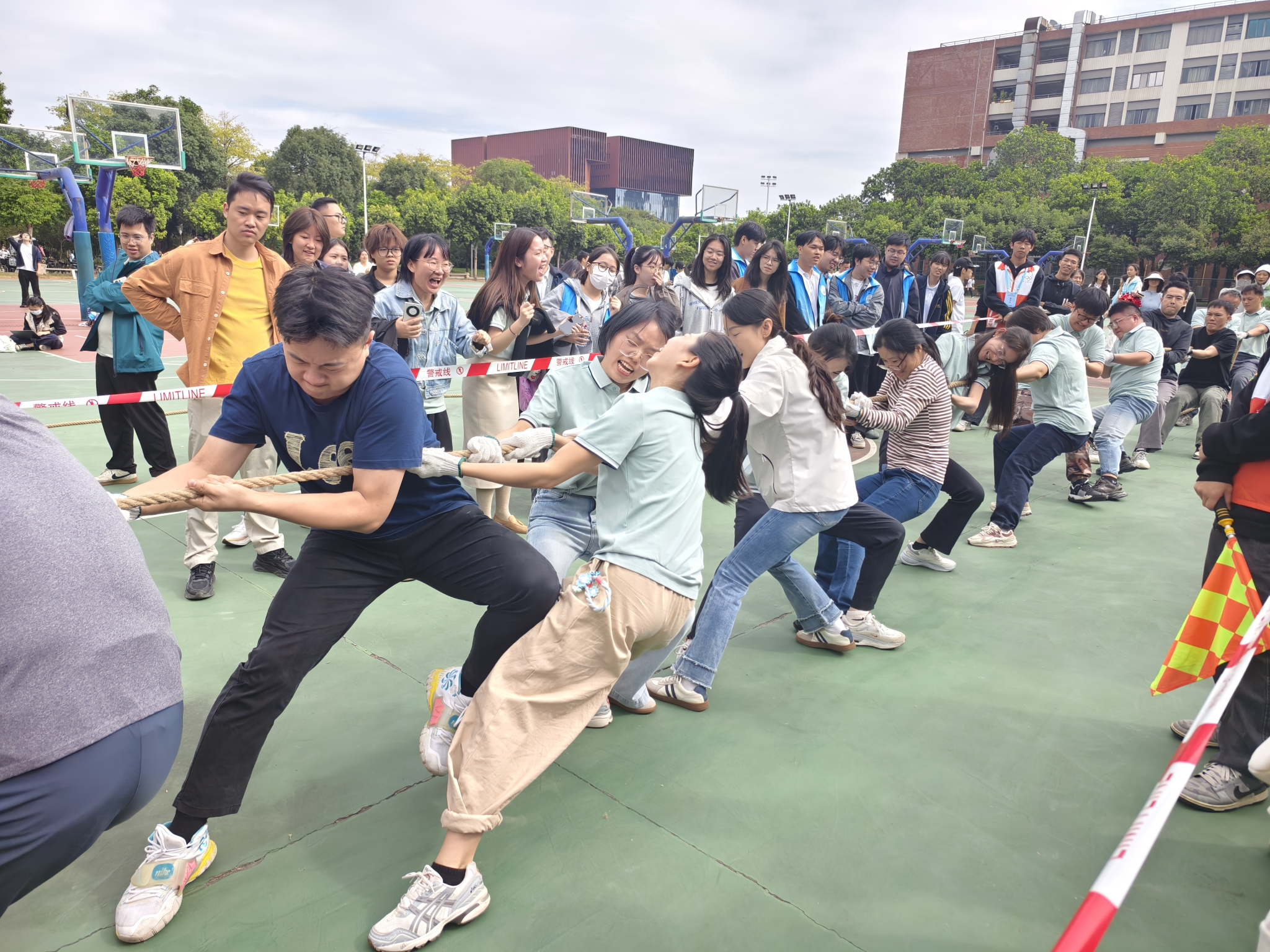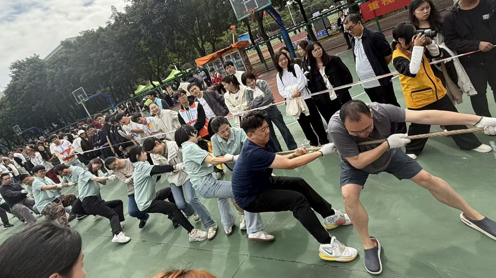 比赛现场气氛热烈,各参赛队伍精神抖擞、斗志昂扬。随着裁判哨声响起,队员们紧握长绳、身体后倾,齐心协力向同一方向发力。场边师生呐喊助威声此起彼伏,“加油”口号响彻校园,将比赛氛围一次次推向高潮。我系参赛教职工队伍凭借默契配合与顽强毅力,在多轮比拼中稳扎稳打,展现出团结协作、奋勇争先的良好精神风貌。